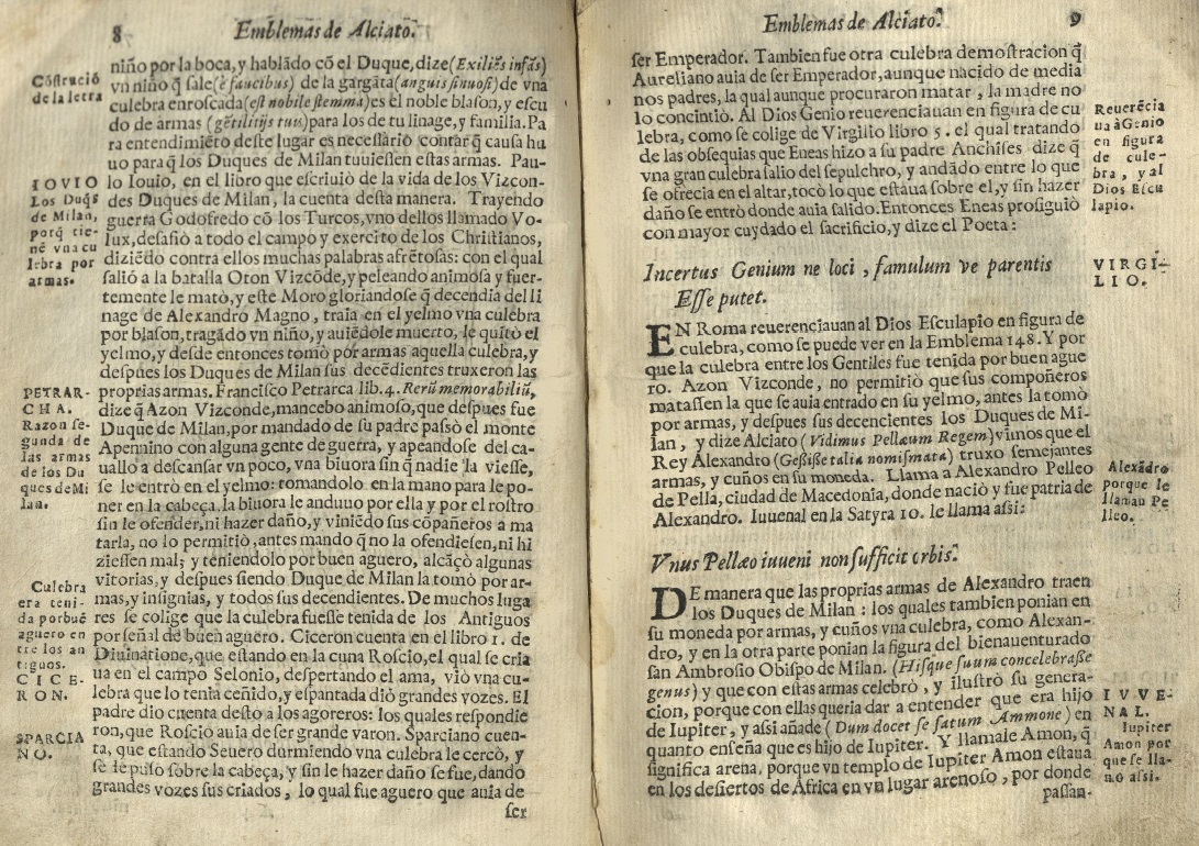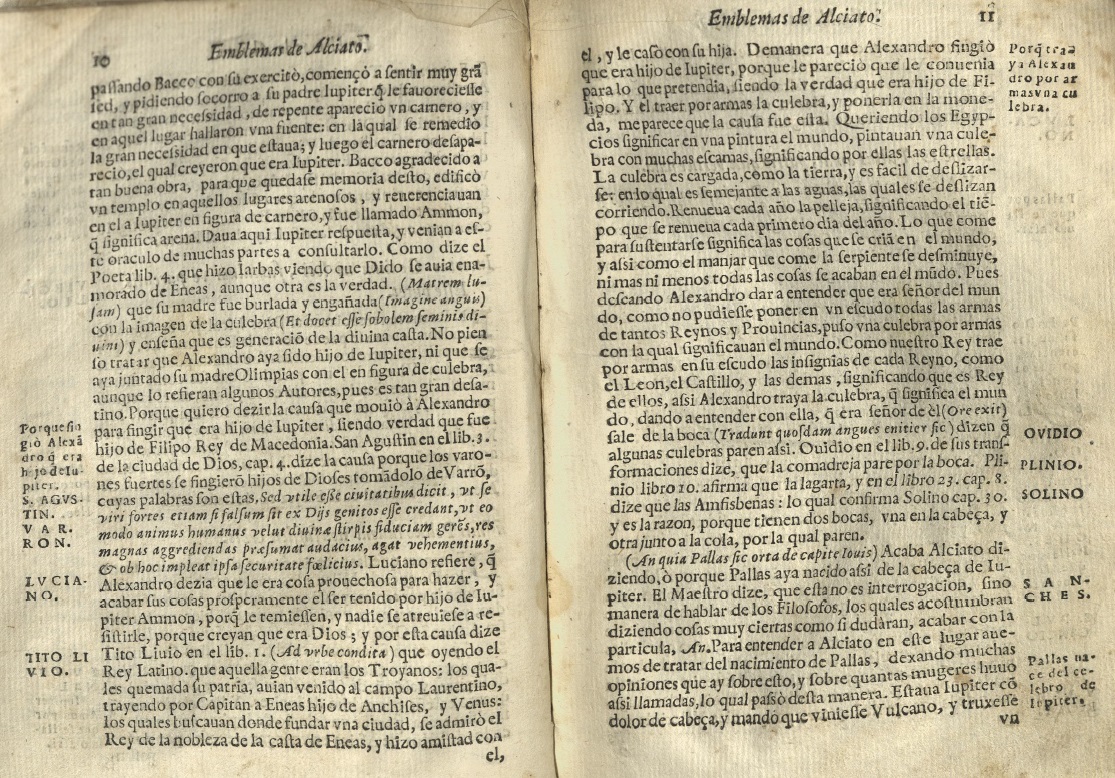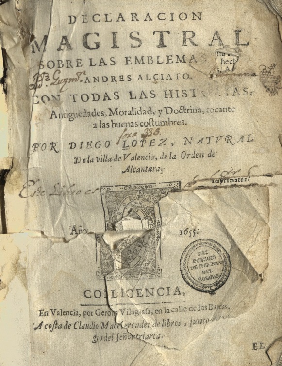 La obra del humanista milanés Alciato (Emblematum libellus, 1531) fue acogida rápidamente en el mundo hispano. Ya en 1549 circulaba una traducción de los emblemas en rima española y, cambiando de centuria, aparecerán acompañados del comento del catedrático Diego López.