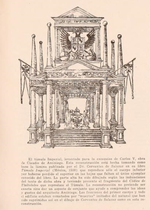 De España su influjo pasa, naturalmente, a América. En una nota, Rafael Gómez señala su presencia “en la decoración del túmulo imperial dedicado a Carlos V”, a cargo de Claudio de Arciniega, en 1559. Concluye así el autor que la influencia de Alciato se atestigua sobre todo en el arte barroco mexicano.